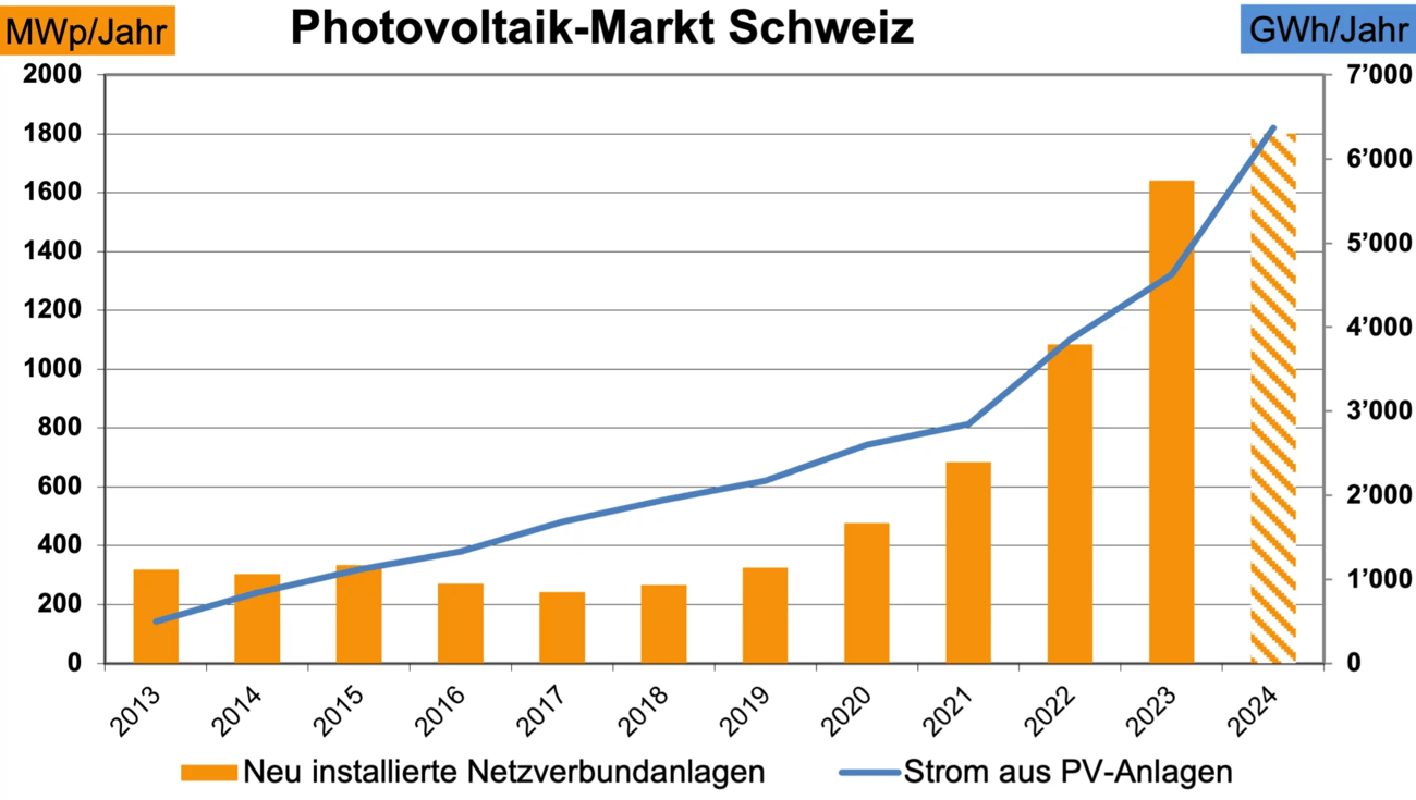 Gemäss der am 11. Juli vom BFE veröffentlichten «Statistik Sonnenenergie» für das Jahr 2023 ist der Photovoltaik-Ausbau in der Schweiz gegenüber dem Vorjahr um 51 Prozent auf 1641 Megawatt angestiegen. Es handelt sich um das vierte Jahr in Folge mit einem Marktwachstum von über 40 Prozent. Insgesamt waren per Ende 2023 in der Schweiz Solarpanels mit einer Leistung von 6.4 Gigawatt installiert, die im Jahresverlauf über 8 Prozent des Schweizer Strombedarfs abdeckten. Mehr Informationen auf swissolar.ch Zur Statistik Sonnenenergie 2023 (PDF) |